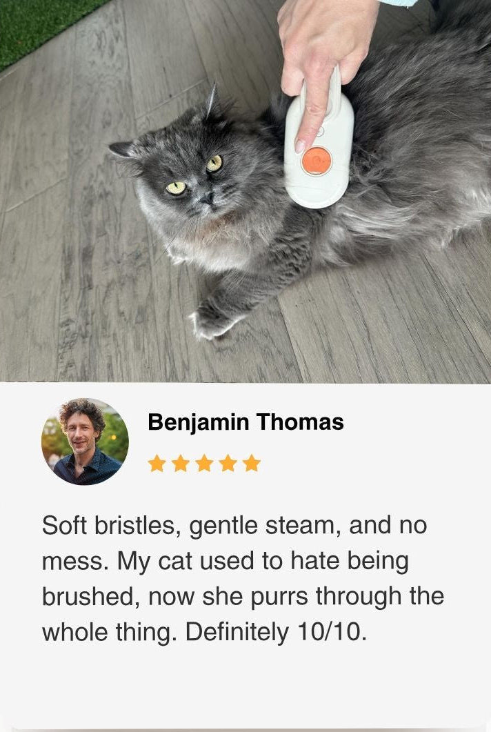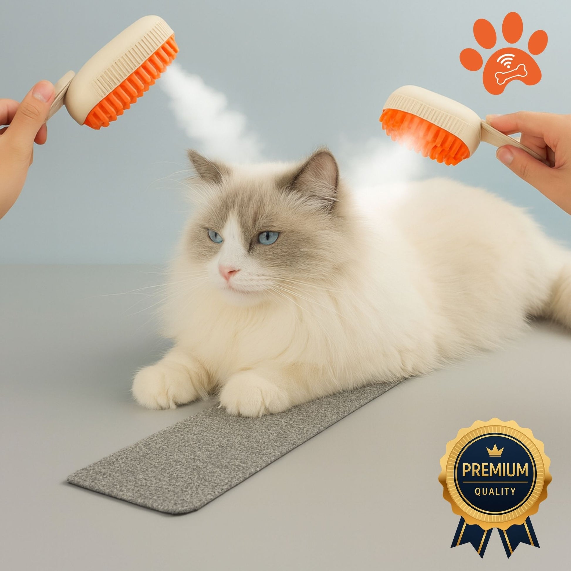 Slow feeding keeps digestion calm, steam brushing keeps fur fresh — together they turn stress into relaxation.